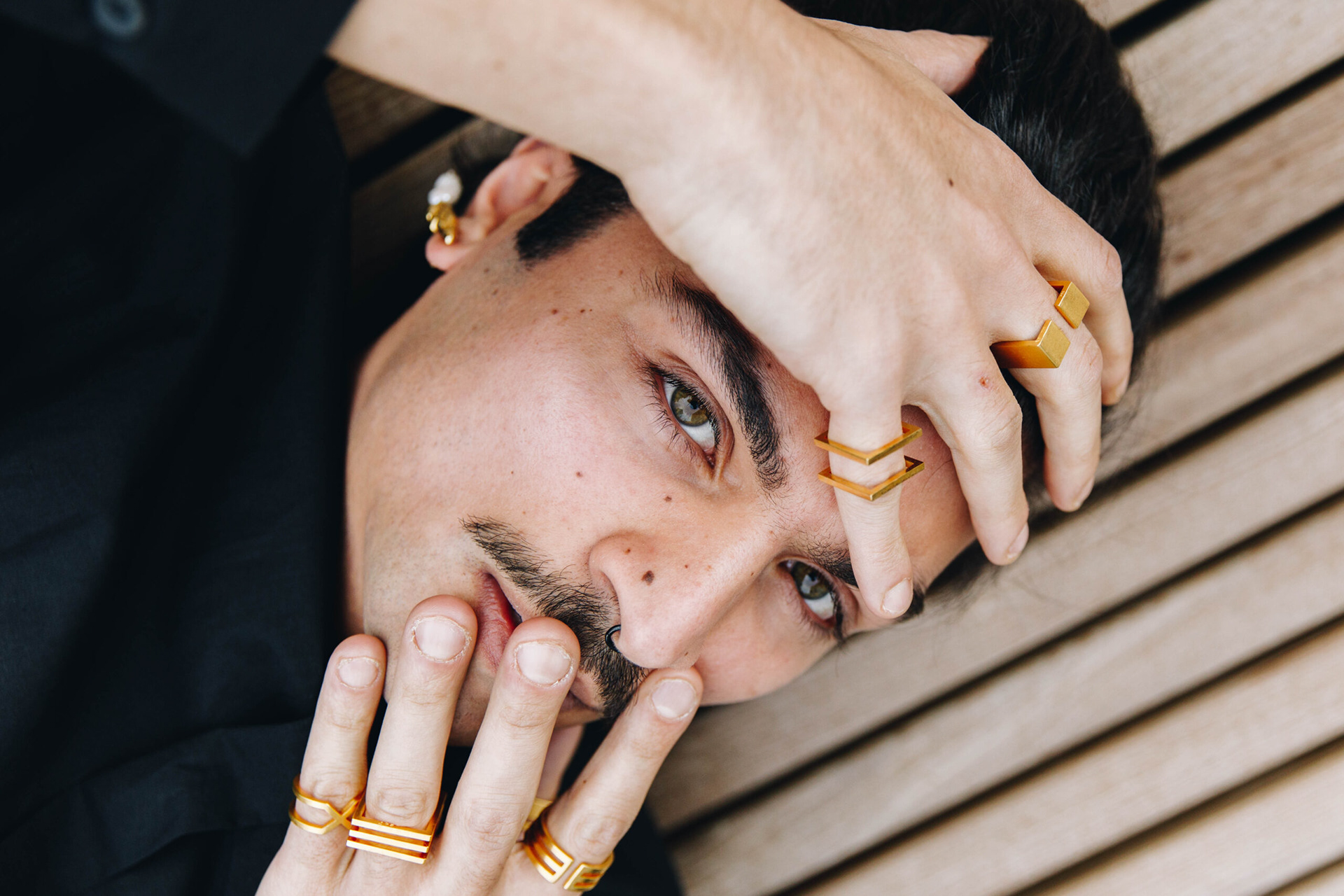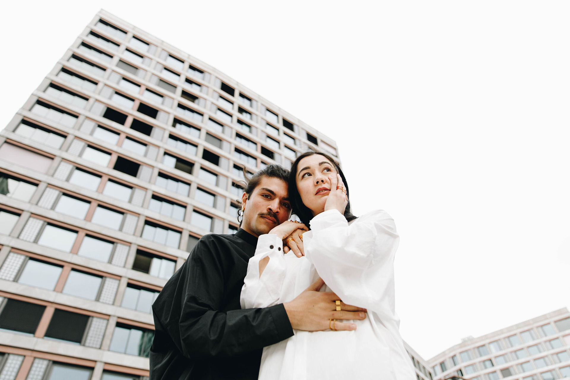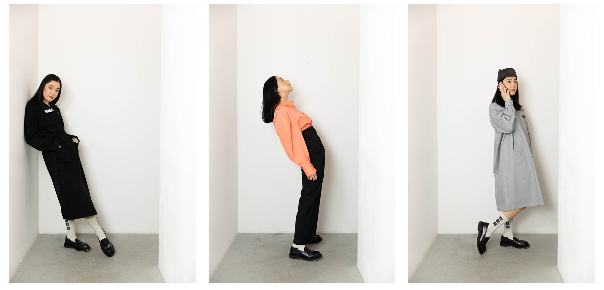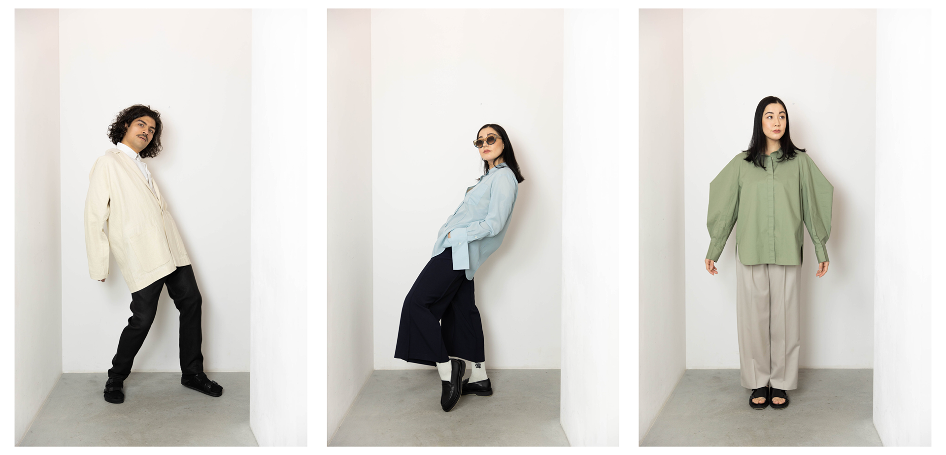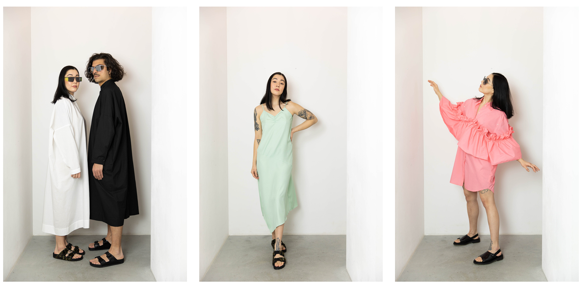 Pictures for the fashion label Opia. The colors overall are cold and the composition of the pictures is minimalistic, to focus the attention of the viewer on the products.